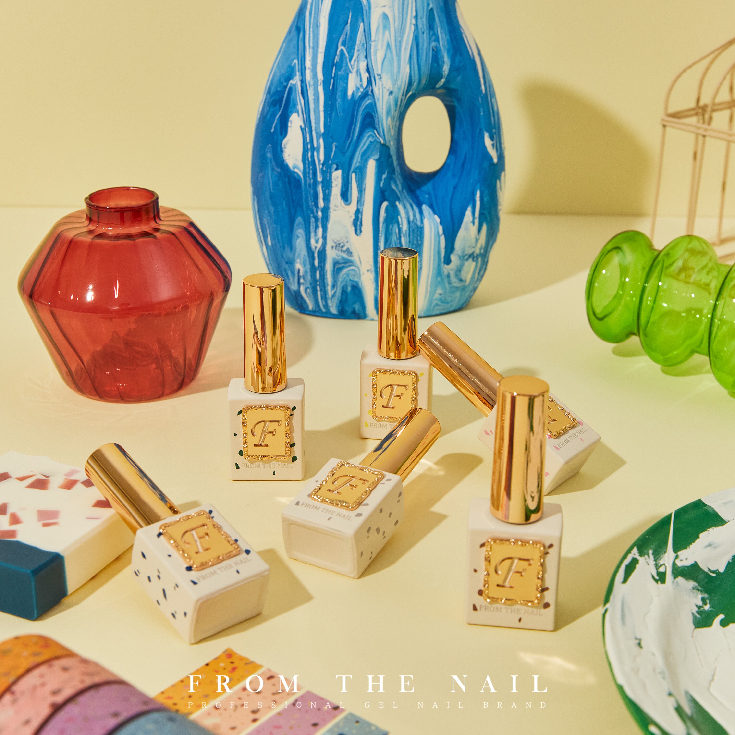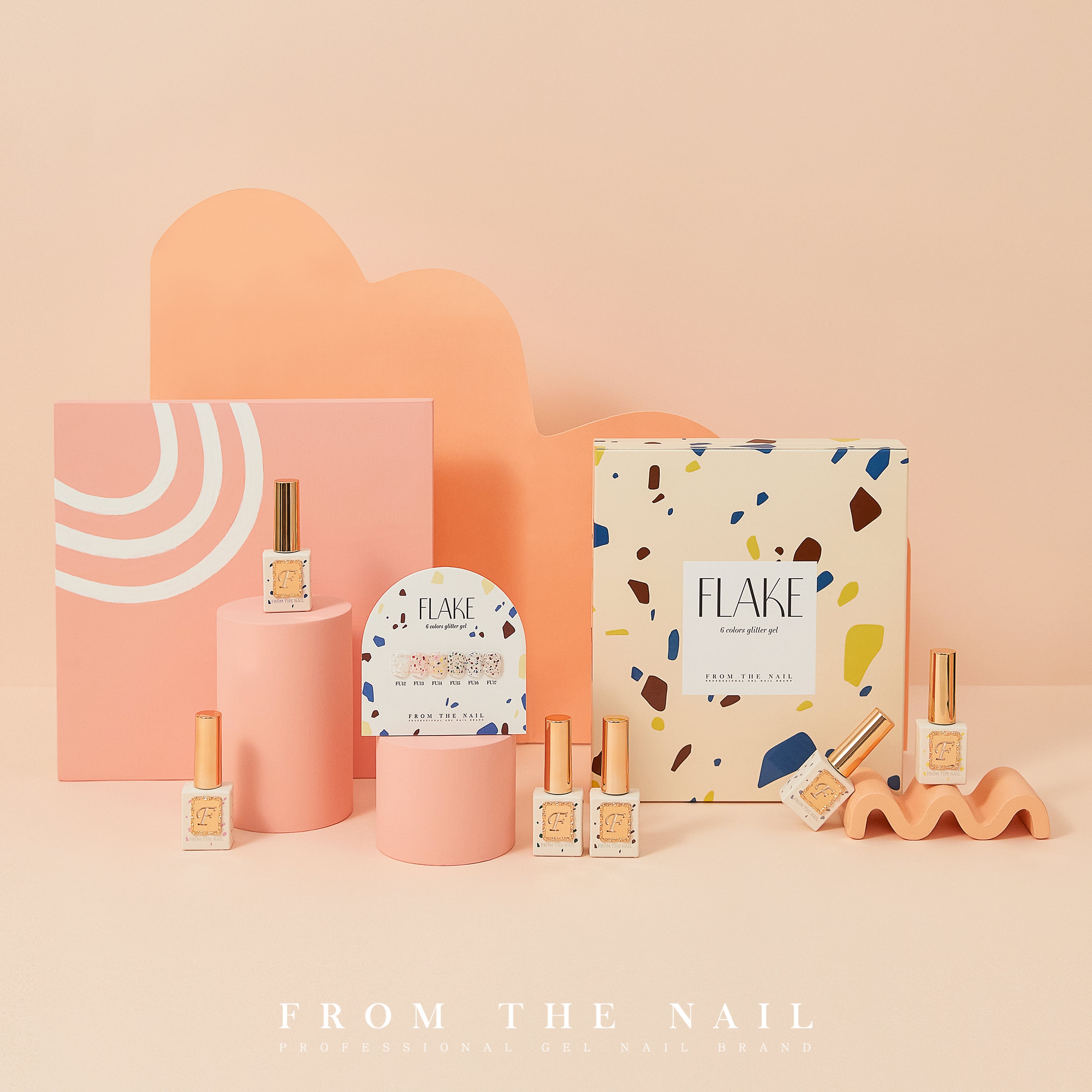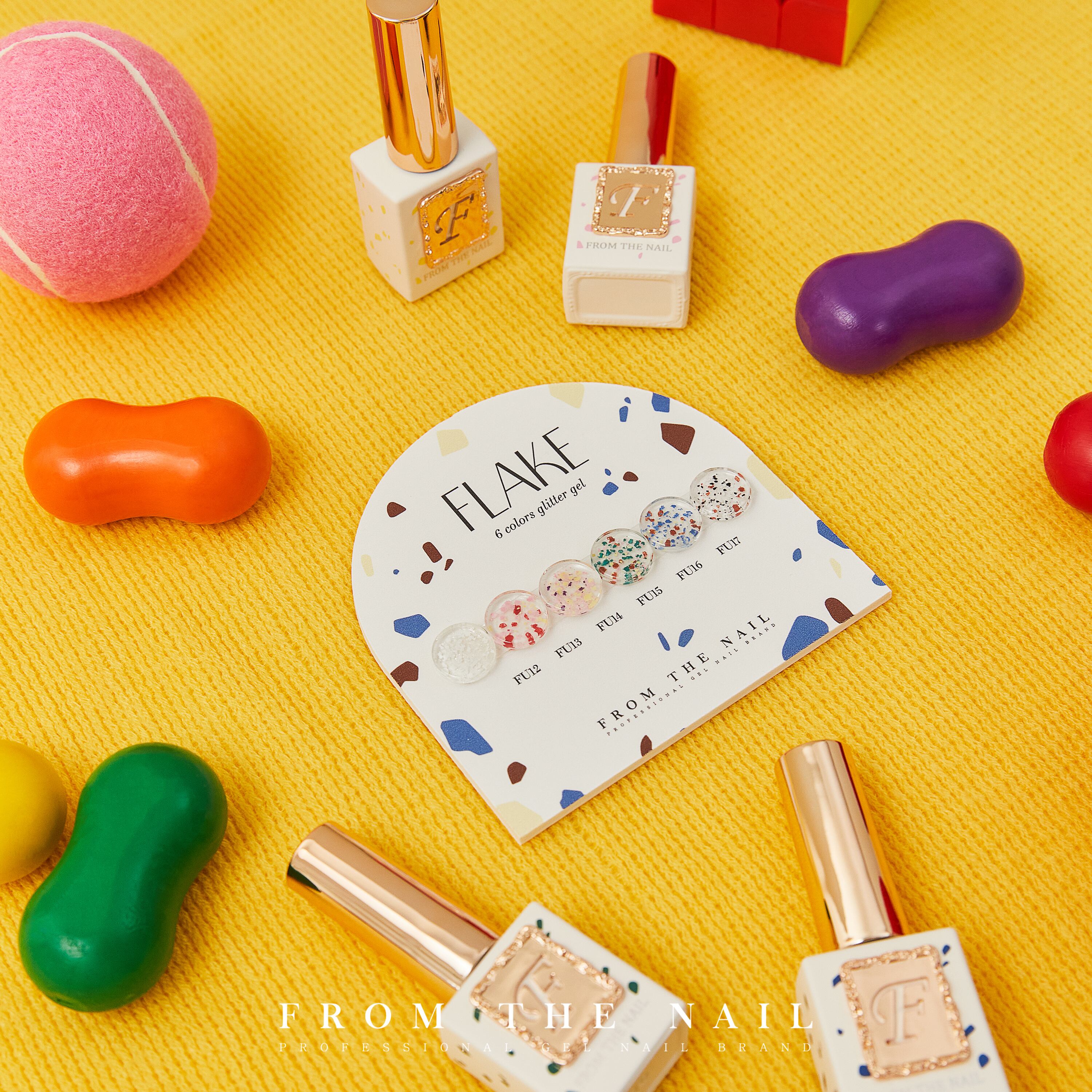 フレークコレクションは、様々なカラーピースが混合されたテラゾタイルからインスピレーションを受けたFROM THE NAIL6色グリッタージェルです。